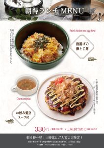 ●卵とだしの相性抜群の【唐揚げの卵とじ丼】  ●口いっぱいに広がる旨味が絶品の【お好み焼】 各330円〈税抜300円〉。