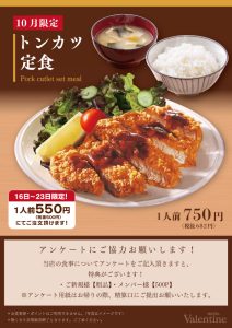 10月の特別メニューは揚げたてのカツがお得な定食に!トンカツ定食!ご飯・味噌汁付。1人前750円〈税抜682円〉