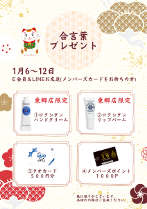 1月のおすすめ ❶ロクシタンハンドクリーム ❷ロクシタンリップバーム *この季節に嬉しい当店だけの賞品です。 〈数に限りがある場合がございます〉。